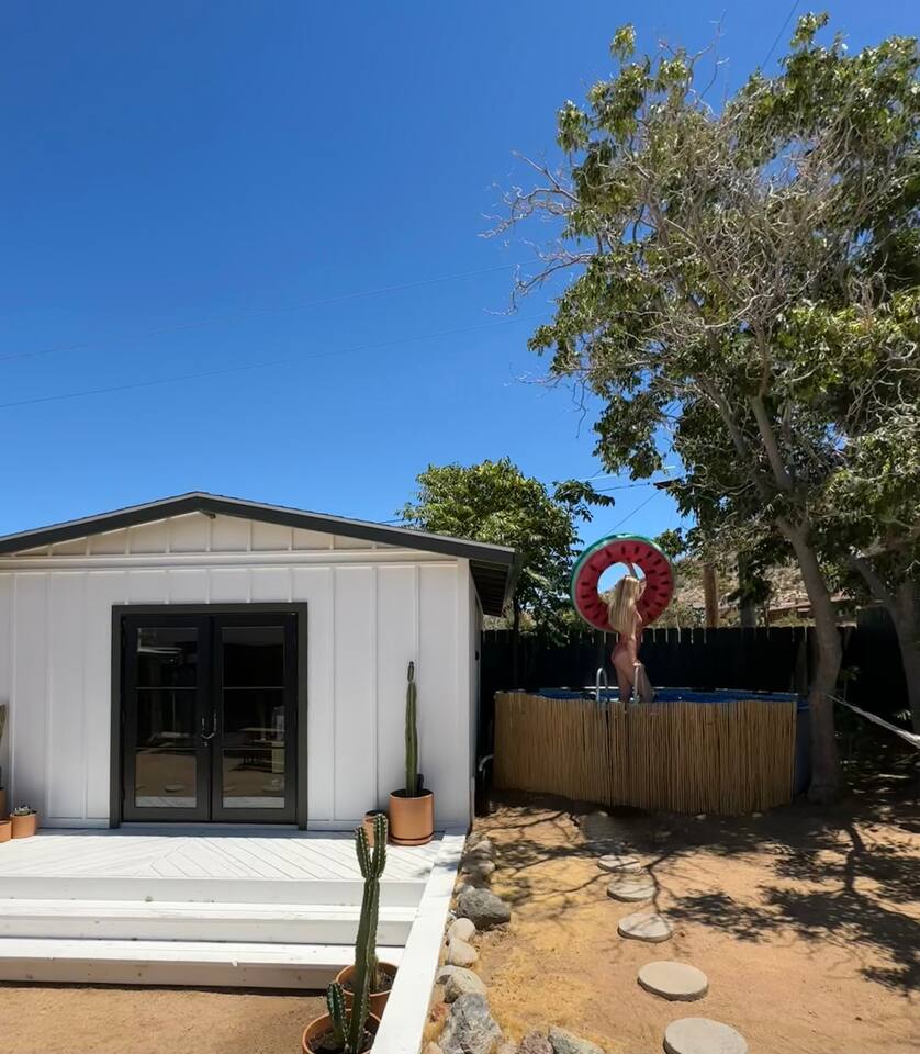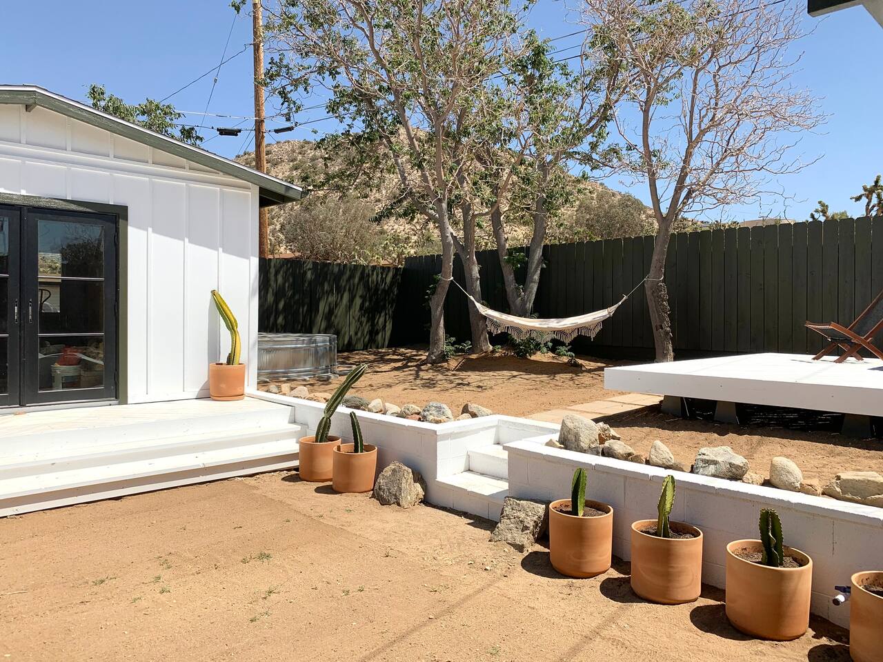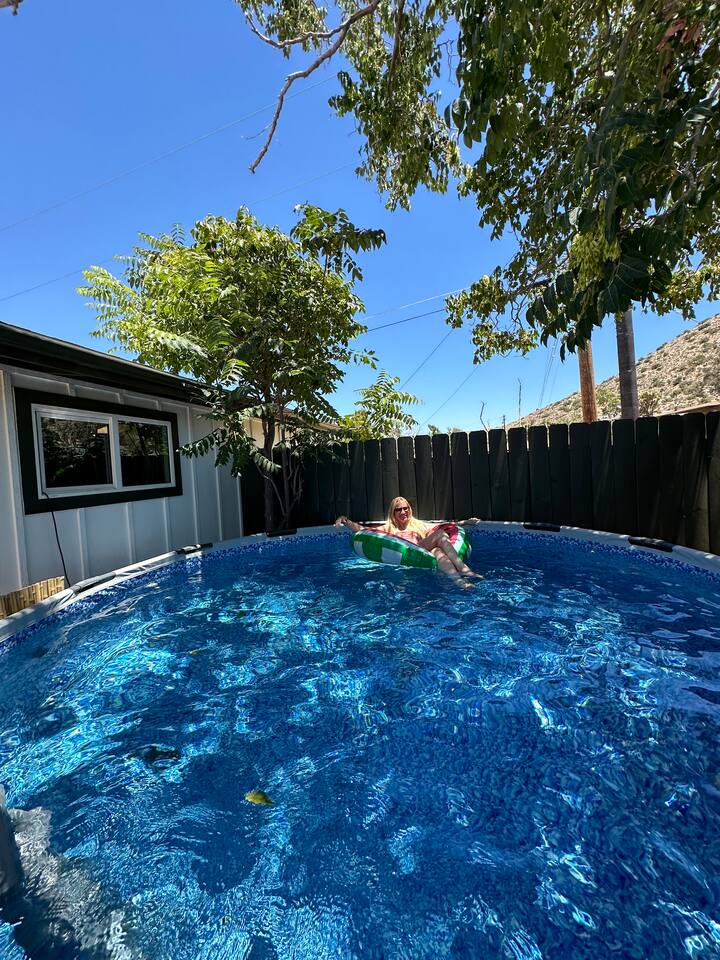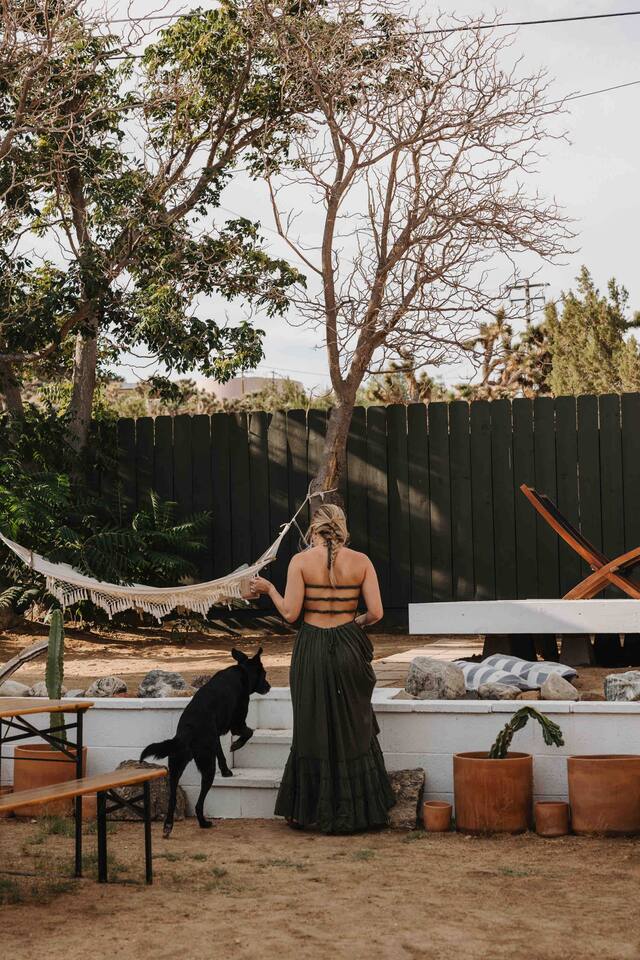 Escape to Casa Santé a 2 bedroom 1 bath home nestled at the base of the mountains in Yucca Valley. Relax outside by the fire pit, new dip pool, & spa. Grill under the stars & bask in the Joshua Trees. Enjoy stunning mountain & valley views from the kitchen and living room. The home is tucked up a short dirt road offering a remote escape while only being 10 minutes from downtown Yucca. The home has been completely renovated in 2022 & we are excited to welcome you to our boutique home get away.